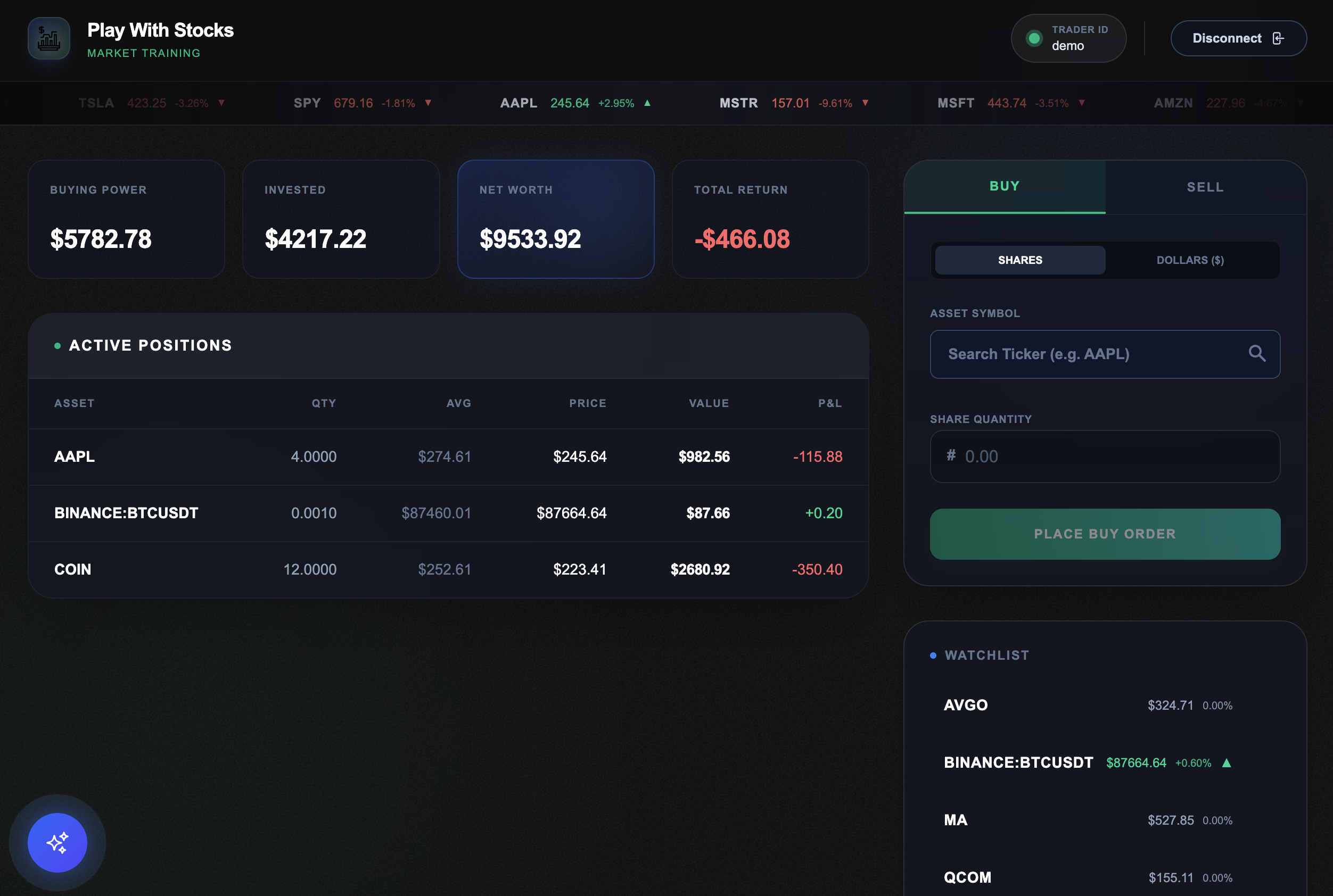 Full Stack Trading Simulator. Integrated Gemini API for AI-based portfolio analysis and implemented user authentication with PostgreSQL.